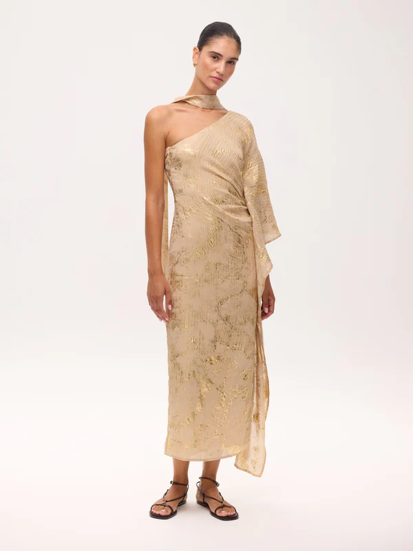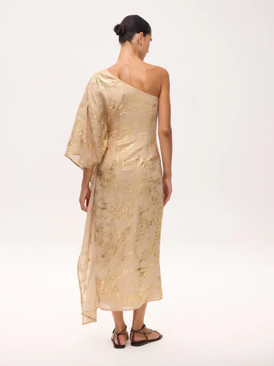Vestido asimétrico manga capa nude con lurex