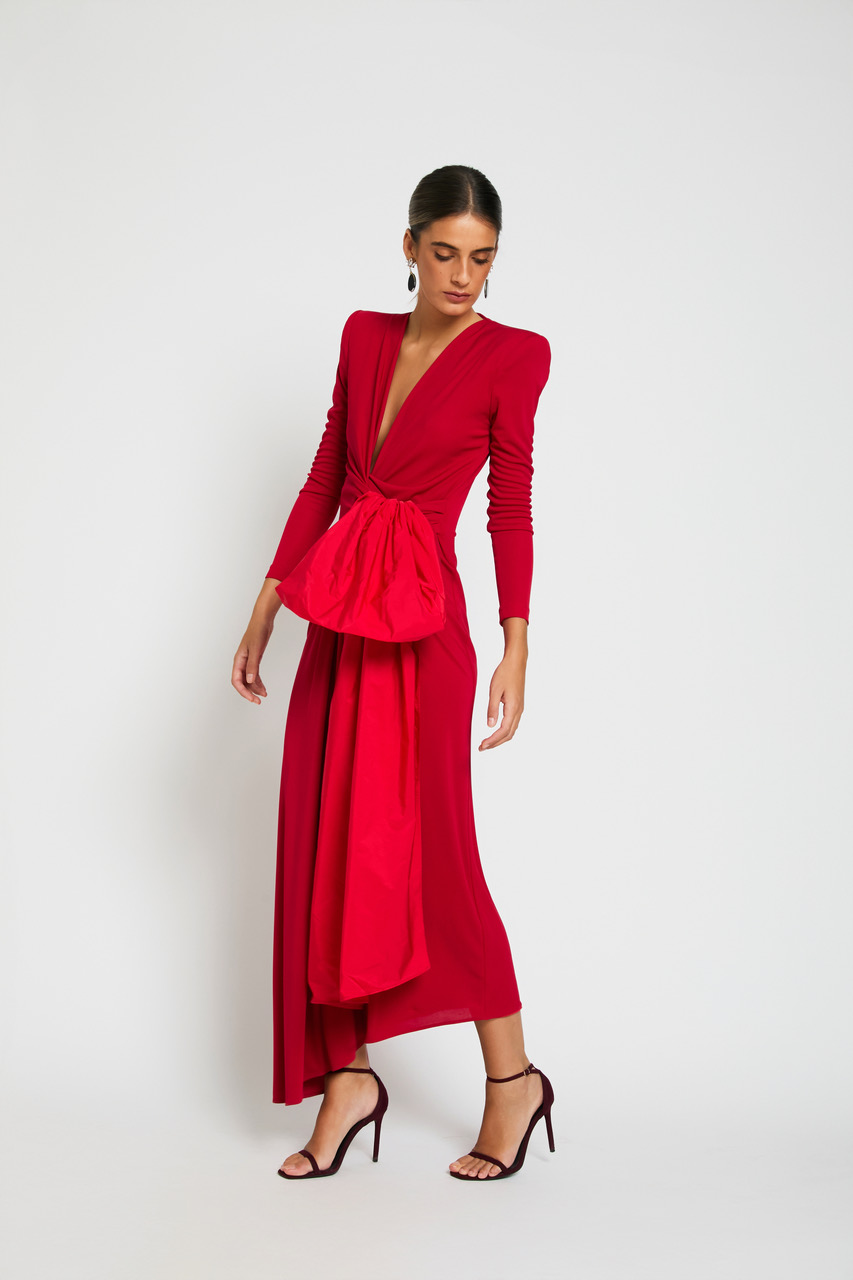 Vestido confeccionado en punto de seda y tafetán con lazo desmontable.