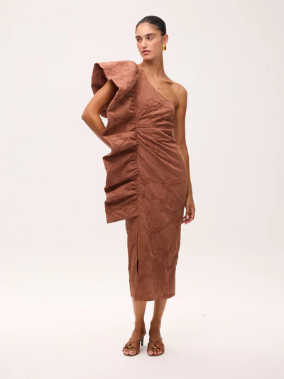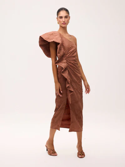 Vestido asimétrico damasco moca