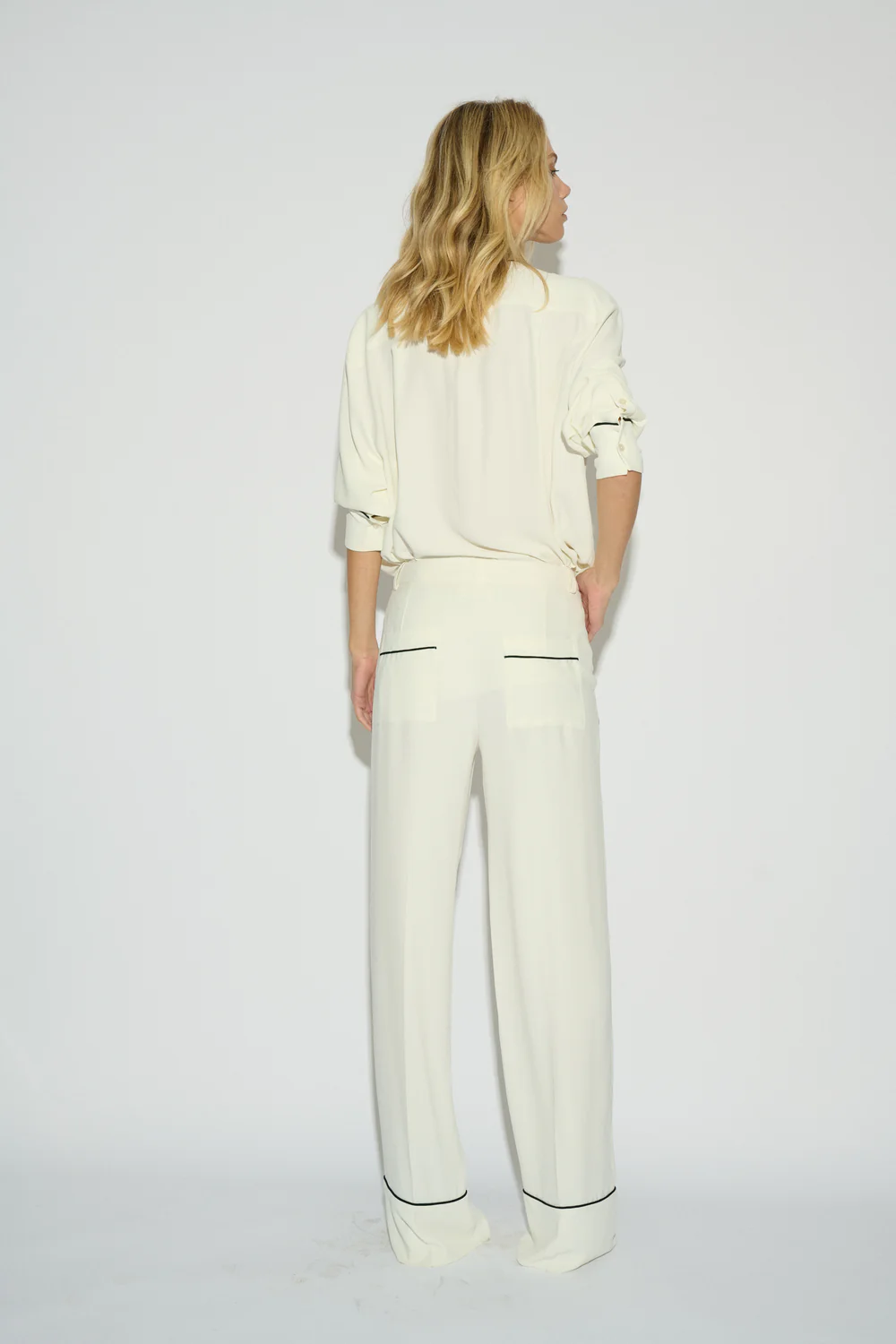Pantalón tipo pijamero de tiro medio con cierre mediante cremallera y botón. Bolsillos laterales y pernera recta ambos acabados en vivos a contraste.