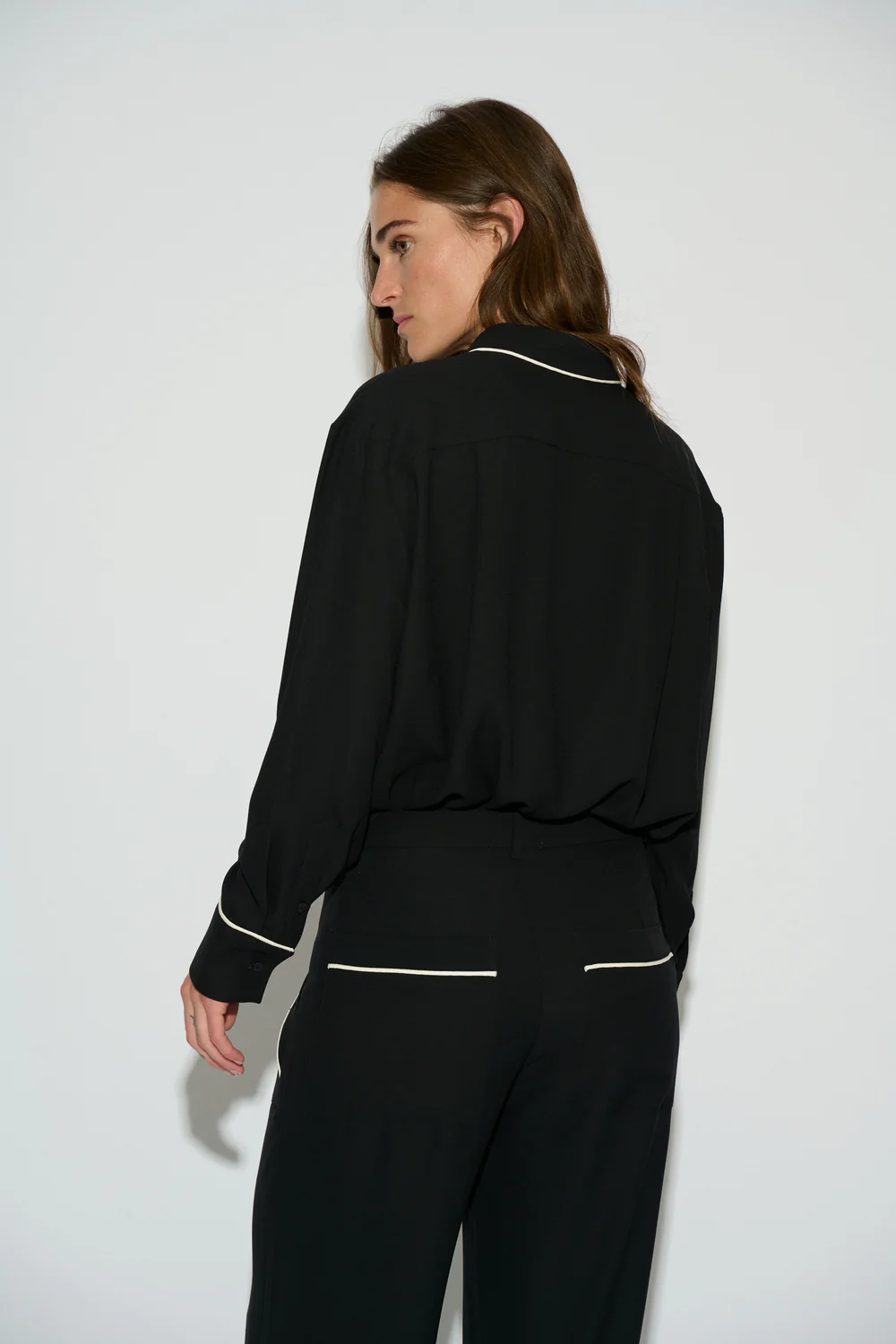 Camisa con cuello solapa y manga larga acaba en puño, con botonadura central. Tapeta y puño con vivo a contraste. Tejido crepe fluido.