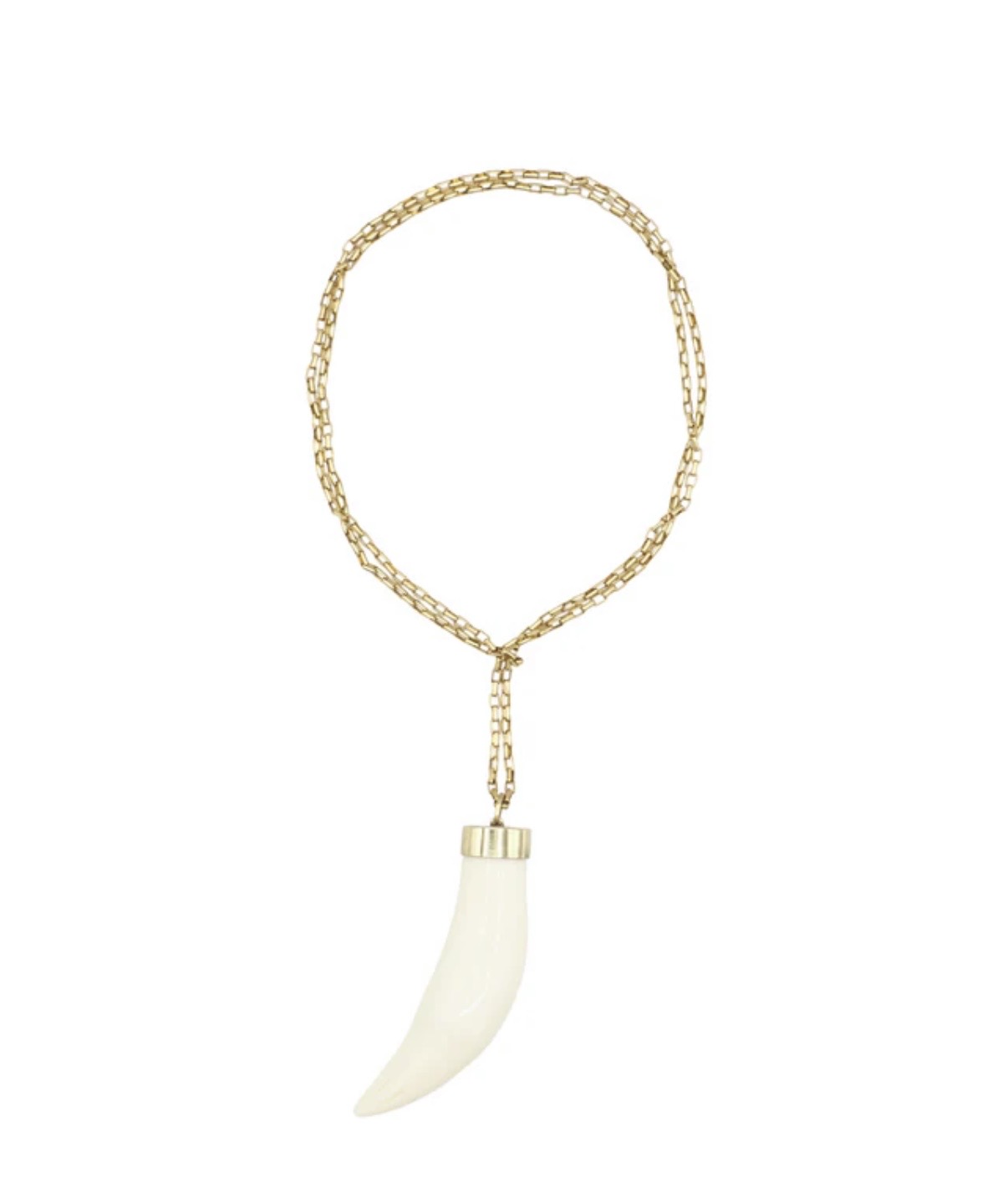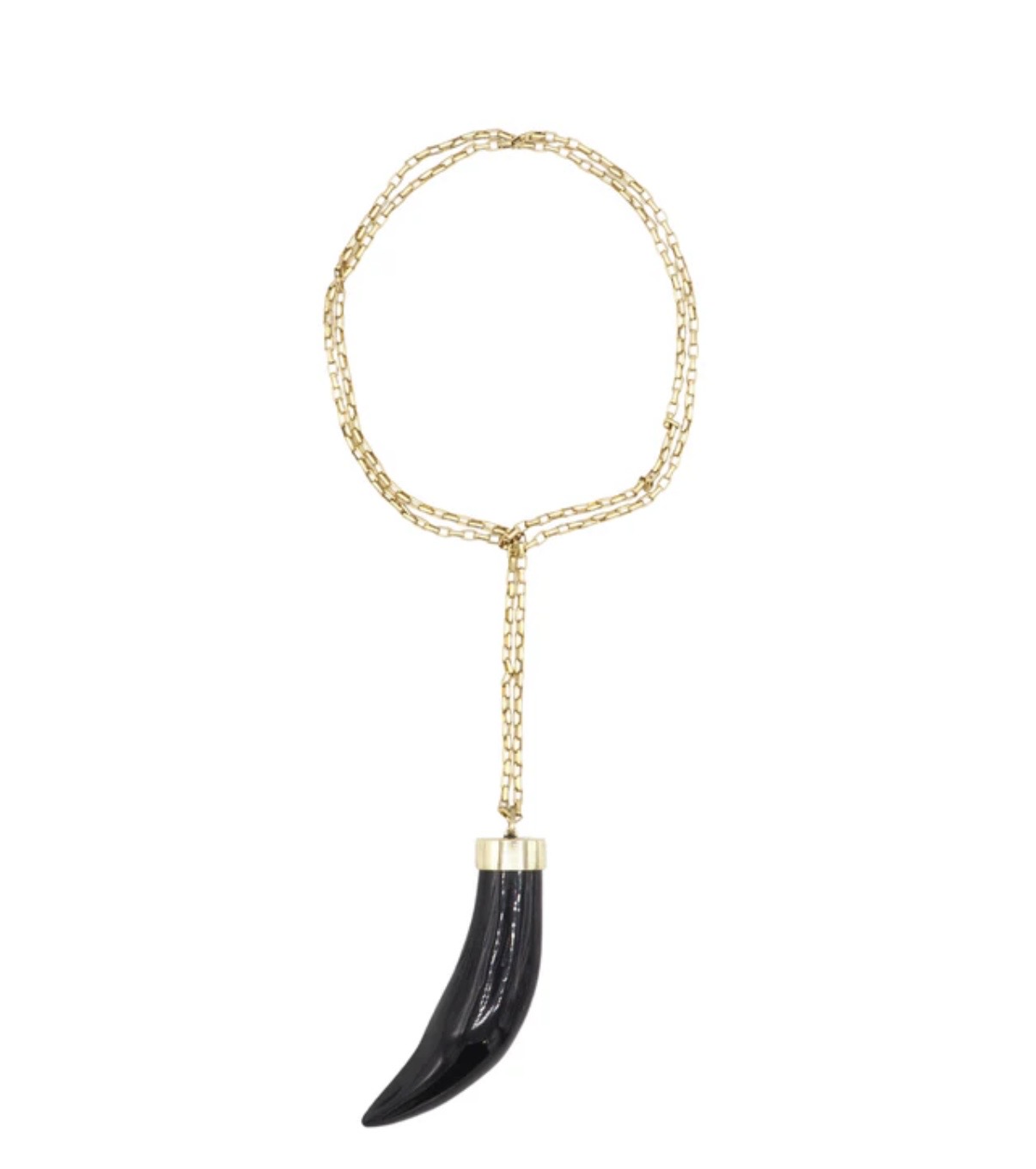 Collar de anillas rectangulares con un cuerno de colgante. Se debe pasar la cadena por detrás del cuello e introducir el cuerno por dentro, para colocarlo tipo corbata.