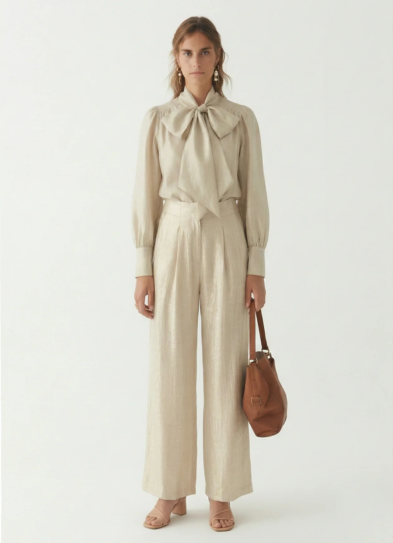 Camisa de manga larga confeccionada en lyocell fluido. Puños anchos con botones forrados y cuello con lazo multiposición. Vuelo desde el canesú y cierre delantero con botones planos forrados.