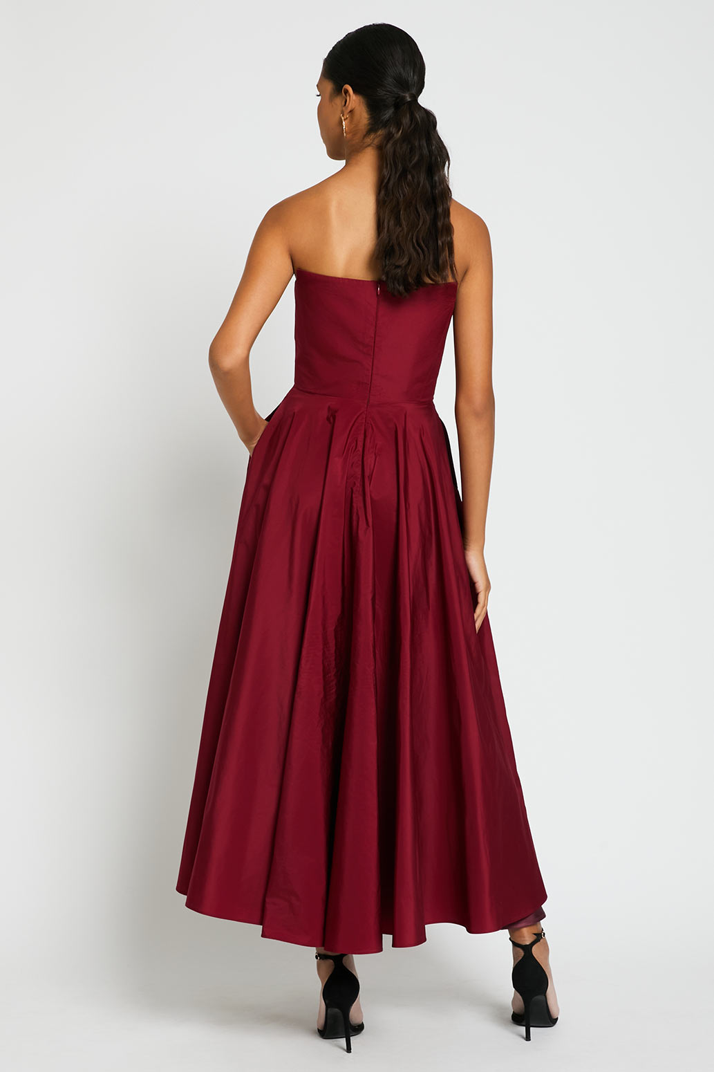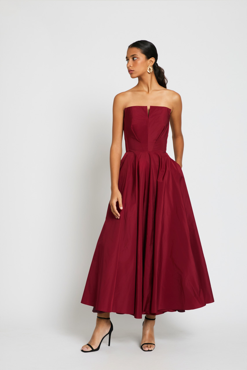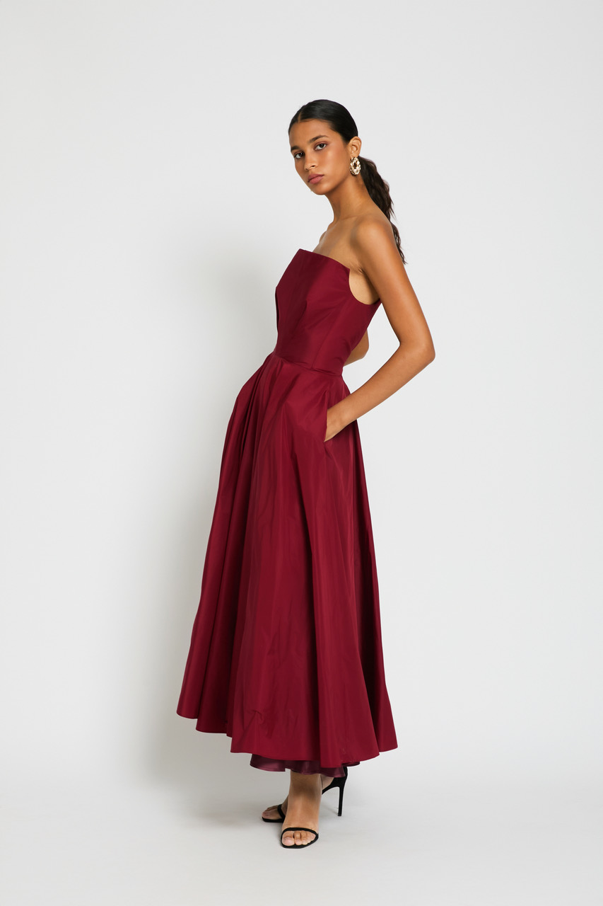 Vestido confeccionado en tafetán escote palabra de honor