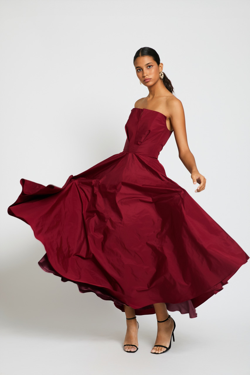 Vestido falda capa en tafetán con cuerpo palabra de honor. Vestido confeccionado en tafetán con falda capa de gran volumen y cuerpo palabra de honor que realza los hombros y estiliza la parte superior. La estructura del tejido aporta presencia y movimiento, creando una silueta elegante y sofisticada. Una opción impactante para invitadas que buscan un look especial para bodas, galas o eventos donde quieras destacar con personalidad y estilo. Diseñado y fabricado en España.