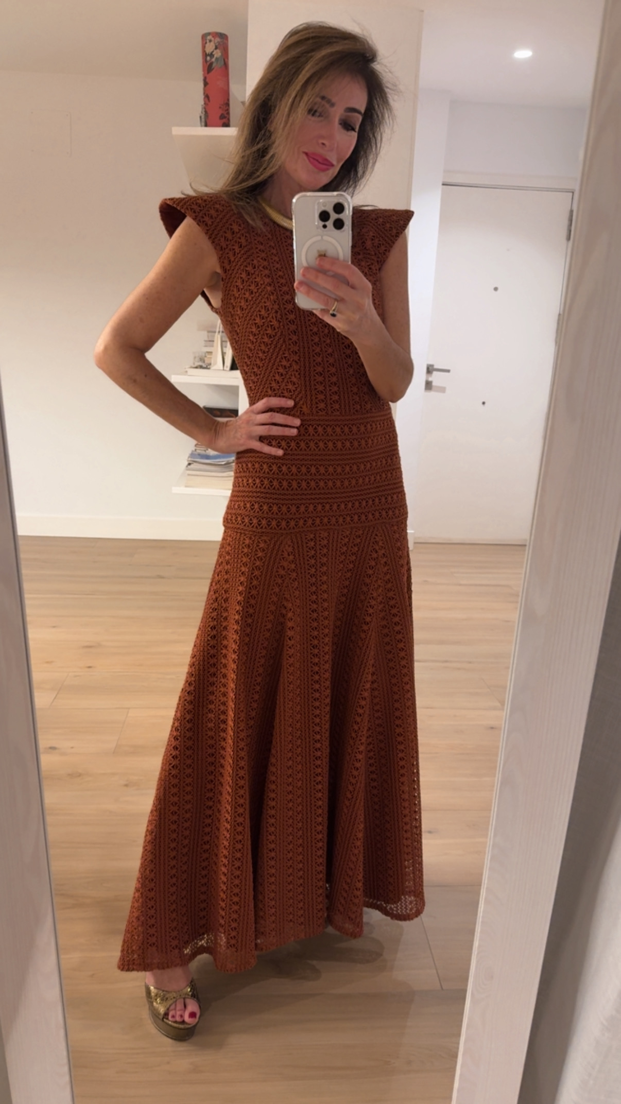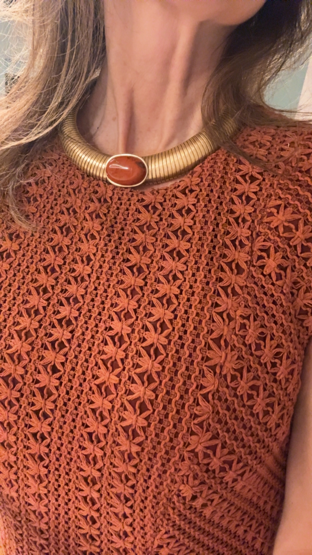 Vestido confeccionado en guipur de maya trenzada. Cuello caja y manga corta.